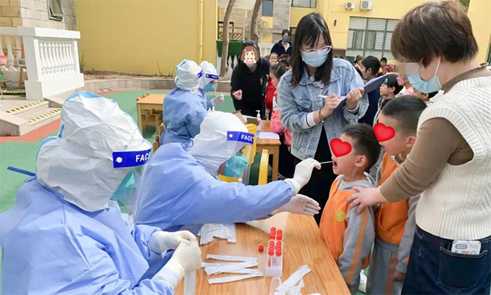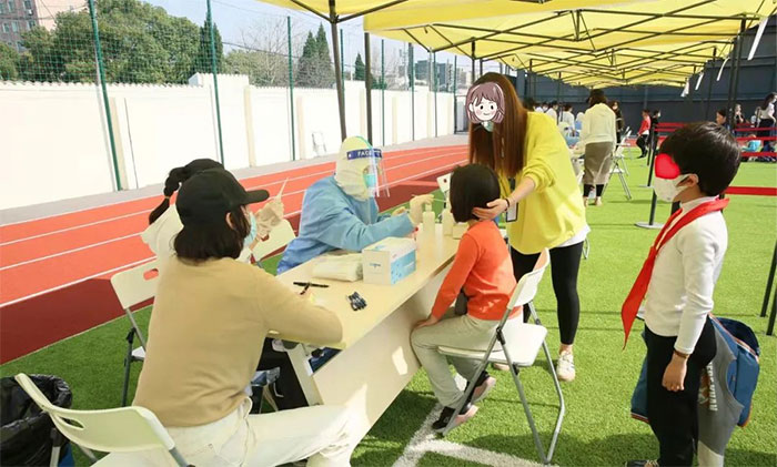 来采样的人群中,有不少年幼的儿童、年迈的老人,“大白”们总是体贴入微,设身处地地从他们的角度出发,或附身低腰、或半蹲半跪地完成采样工作。