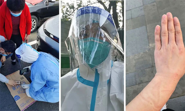 有谁能想到,看着就让人心安的“大白”,在卸下一身“装备”后,里面会是怎样一副模样?衣衫早已被汗水浸透;手上的皮肤被泡得肿胀发白;脸上是两道深深的勒痕;耳朵已经被勒红,甚至磨破了皮;勃颈处因为高温湿热,捂出了一片片的红疹;还有一些人甚至出现了轻微中暑现象,头晕、头痛、腰酸腿麻等,无法一一尽数。