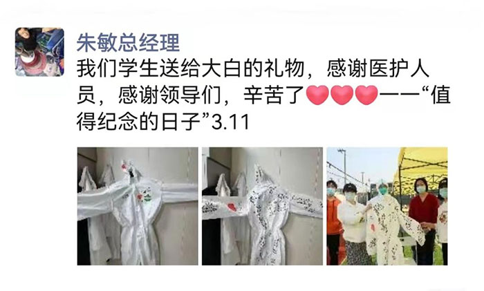 上海蓝十字脑科医院总经理兼党支部书记朱敏,在看到这件“礼物”时也深受触动,第一时间配文发送到朋友圈。一个“值得纪念的日子”,鼓舞着所有在抗疫一线奋战的人们。
