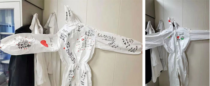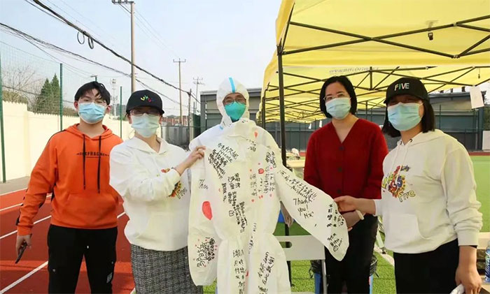 11日,在万科双语学校,蓝十字脑科医院核酸采样队员收到了一份特殊的礼物——一件写满了祝福语的防护服。“谢谢你们,辛苦了!爱你们!”、“你们是最美的!”、“感谢你们舍身为人的帮助!”、“愿疫情早日过去!”……这是六年级3班的孩子们亲手制作的“谢礼”,在场所有人都被深深地感动了。