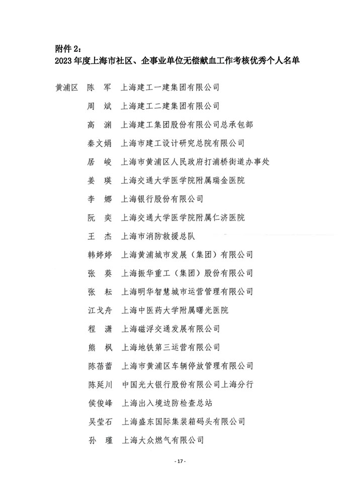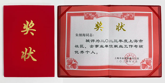 ▲ 朱细海科长被评为2023年度上海市社区、企事业单位献血工作考核优秀个人。