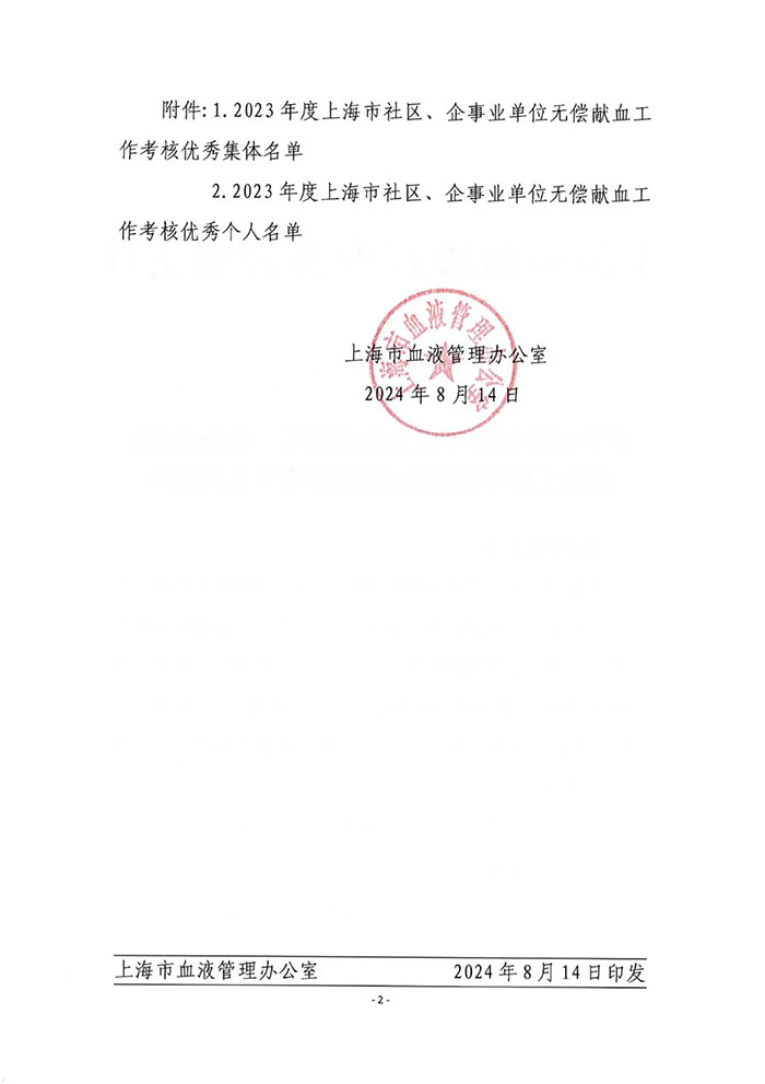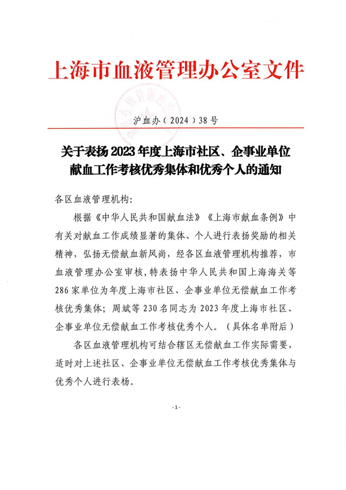 根据上海市血液管理办公室发布《关于表扬2023年度上海市社区、企事业单位献血工作考核优秀集体和优秀个人的通知》【沪血办(2024)38号】,为弘扬无偿献血新风尚,经各区血液管理机构推荐,市血液管理办公室审核,表扬全市286家单位为年度上海市社区、企事业单位无偿献血工作考核优秀集体;上海蓝十字脑科医院【同济大学附属上海蓝十字脑科医院(筹)】医务科朱细海科长等230名同志为2023年度上海市社区、企事业单位无偿献血工作考核优秀个人。