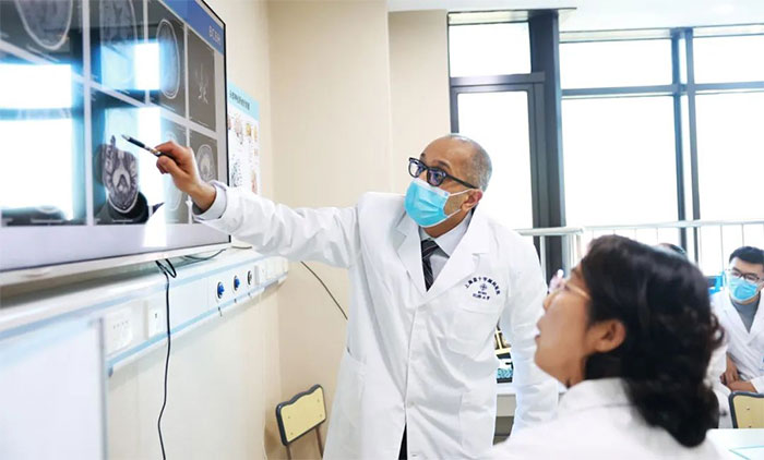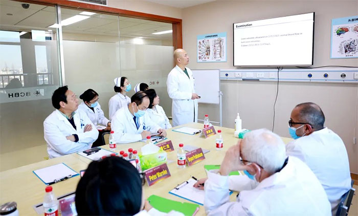 当天下午,芝加哥大学医学中心专家们与临床科室开展了会诊讨论。副院长潘耀良,副院长周克祥,神经内科7A病区主任张静波,医院神经外科学术副院长、神经外科6A病区主任于耀宇,神经外科6B病区主任潘仁龙,医院学术副院长、神经内科4A病区主任席刚明教授,神经内科4A病区副主任王贵平博士以及部分青年医生参加讨论。