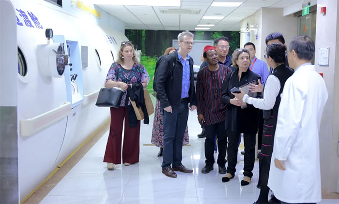 参观过程中,他们对医院业务开展、学科建设、特色医疗技术、设施设备等表现出浓厚的兴趣,并进行了现场交流。值得一提的是,在高压氧科,规模宏大的氧舱群让专家代表们眼前一亮,大家驻足良久,纷纷拿出手机拍照留念。