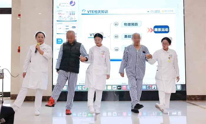 在实操演示环节,武玉燕护士长和团队护士一起,边示范边详细讲解动作要领。为了让大家更好地掌握技巧,武玉燕护士长还邀请几位患者和家属上台进行现场实操,耐心纠正他们的动作偏差。“动作一定要慢,幅度要到位,这样才能达到锻炼效果。”她手把手地指导调整姿势,患者和家属纷纷跟着护士长的节奏一起练习起来。在轻松愉快的互动中,大家很快掌握了“踝泵运动”。
