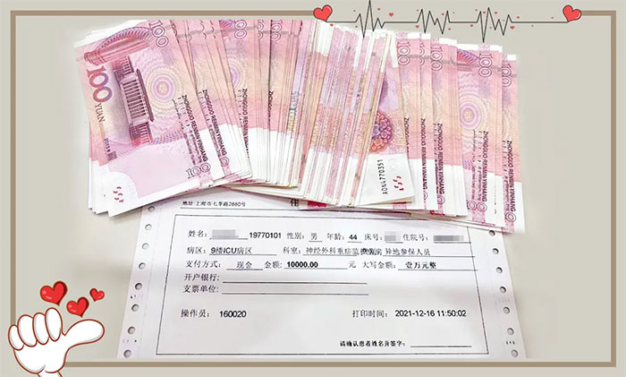 “刘主任,你是我们家的救命恩人,这是小小心意,请一定要收下!”在梁先生家属的一再坚持下,为了让他们安心,刘主任只好暂时答应替他们保管。会面结束后,刘纪强主任第一时间将这个“沉甸甸”的红包上交给了院部,作为梁先生住院费登记入账。