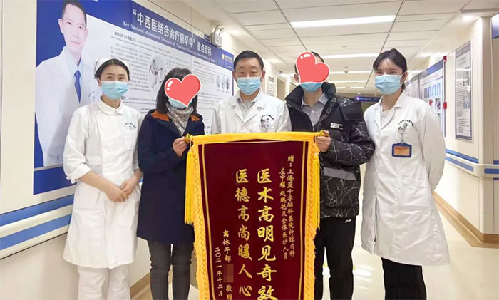 李女士住院期间,原单位老干部处的同志专程来医院探病,见她恢复如此之好,对余志良博士团队深表感激。在李女士一力请托下,事后还专程送来锦旗,以感谢余志良博士团队的精心治疗和贴心服务。