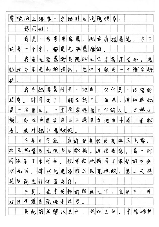 而在上海蓝十字脑科医院神经内科、脑血管病科医疗团队的携手努力下,凭借专业的诊疗技术和优质的服务,使患者得以成功手术,转危为安,不负患者家属的信任。正基于此,这封感谢信才显得格外的情真意切。
