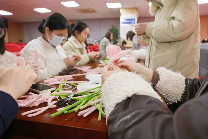 手作体验环节分国风竹节包、扭扭棒郁金香花束两组同步进行。结合教学视频,分别由专业手作老师为大家细致讲解制作步骤,手把手演示制作技巧。平日里辛勤的白衣天使们,此刻化身专注的 “手作匠人”,暂时放下工作的忙碌,全身心投入到手作之中。