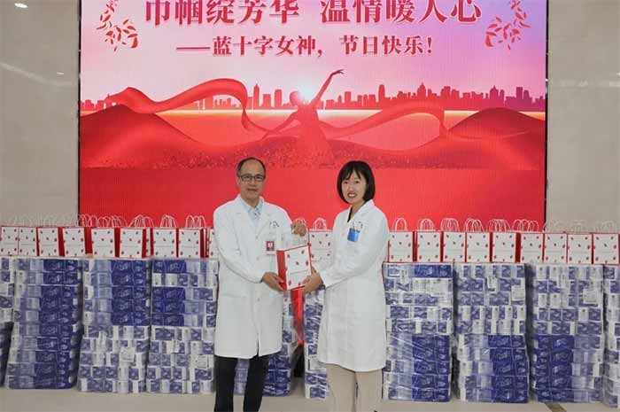 3月6日下午15:30,医院门诊大堂洋溢着节日的温馨与喜悦。“巾帼绽芳华 温情暖人心——蓝十字女神,节日快乐!”的主题标语在电子屏上格外醒目。医院书记朱敏、院长项耀钧等院领导亲临现场,为来自各科室的女职工代表送上精心准备的节日礼包,向大家致以节日的问候,并感谢她们长期以来在各自岗位上的辛勤付出与无私奉献。