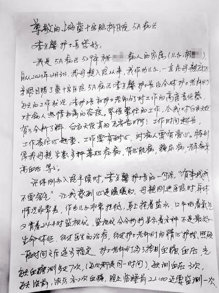 近日,上海蓝十字脑科医院神经内科5A病区收到一封患者家属手写的感谢信,朴实的语言、字里行间表达着对医护人员的感激之情。感谢医护人员对母亲无微不至的关怀和照护及医院对护士的精心培养,赞赏医护人员精湛的护理技能、敬业负责的态度,同时,也表达了护士节的祝福,发自内心地说,“你们无愧于‘白衣天使’这个神圣的称号!”