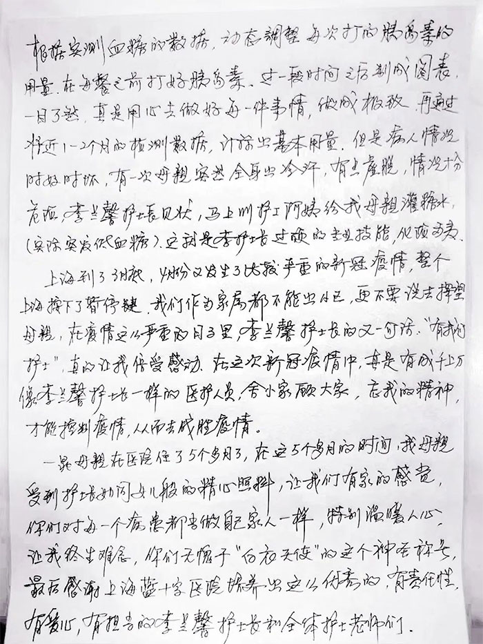 上海到了3月底,4月份又发生了比较严重的新冠疫情,整个上海按下了暂停键,我们作为家属都不能出小区,更不要说去探望母亲,在疫情这么严重的日子里,李兰馨护士长的又一句话:“有我们护士”,真的让我倍受感动。在这次新冠疫情中,真是有成千上万像李兰馨护士长一样的医护人员,舍小家顾大家,忘我的精神,才能控制疫情,从而去战胜疫情。