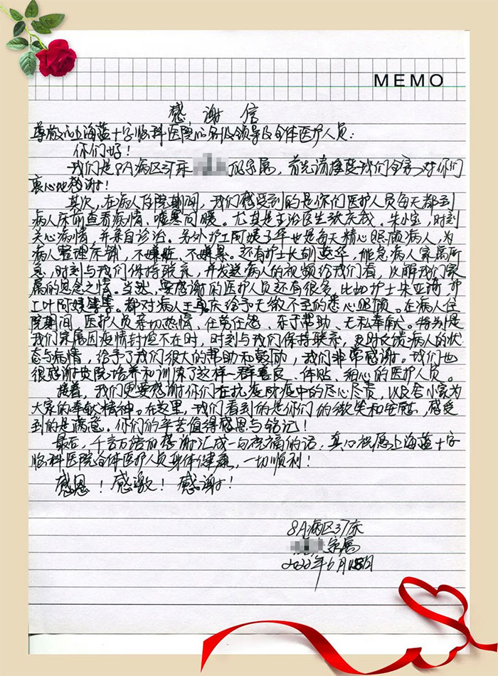 上海蓝十字脑科医院神经内科重症监护8A病区张庆成主任团队,收到一封患者手书的感谢信。信手而撕下的一页笺纸上,以朴实无华的文字,记录着患者及家属的心路历程。