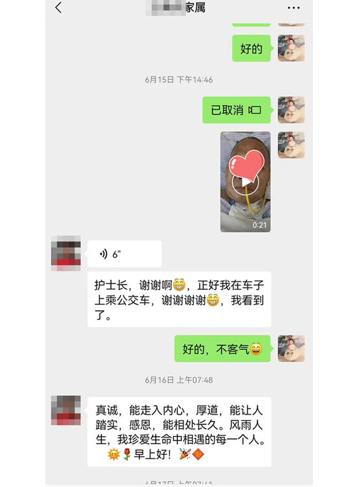为此,胡燕华护士长与团队成员协商,决定用视频电话的方式,为患者和家属架设一座“连心桥”。通过“现场直播”的方式,让家属们及时了解患者的康复进程和健康状态。亲眼看一看,亲耳听一听,让亲情和血脉再度相连。