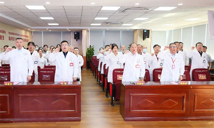“我志愿献身人类的健康事业;自觉维护医学的尊严和神圣;敬佑生命,救死扶伤……”副院长潘耀良带领现场所有医师重温《中国医师宣誓誓词》。大家举起右拳,像正式成为一名医生那天一般虔诚,庄重宣誓。