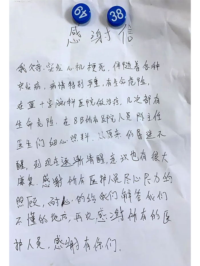 该患者几度病情危重,陈泥主任带领团队精心救治,使其化险为夷、转危为安。治疗过程中,家属十分焦虑,陈泥副主任不仅就治疗方案与家属耐心沟通,还总是百忙之中加以劝慰安抚,让家属倍感温暖。于是手写了感谢信送给陈泥副主任及医护表示由衷感谢。
