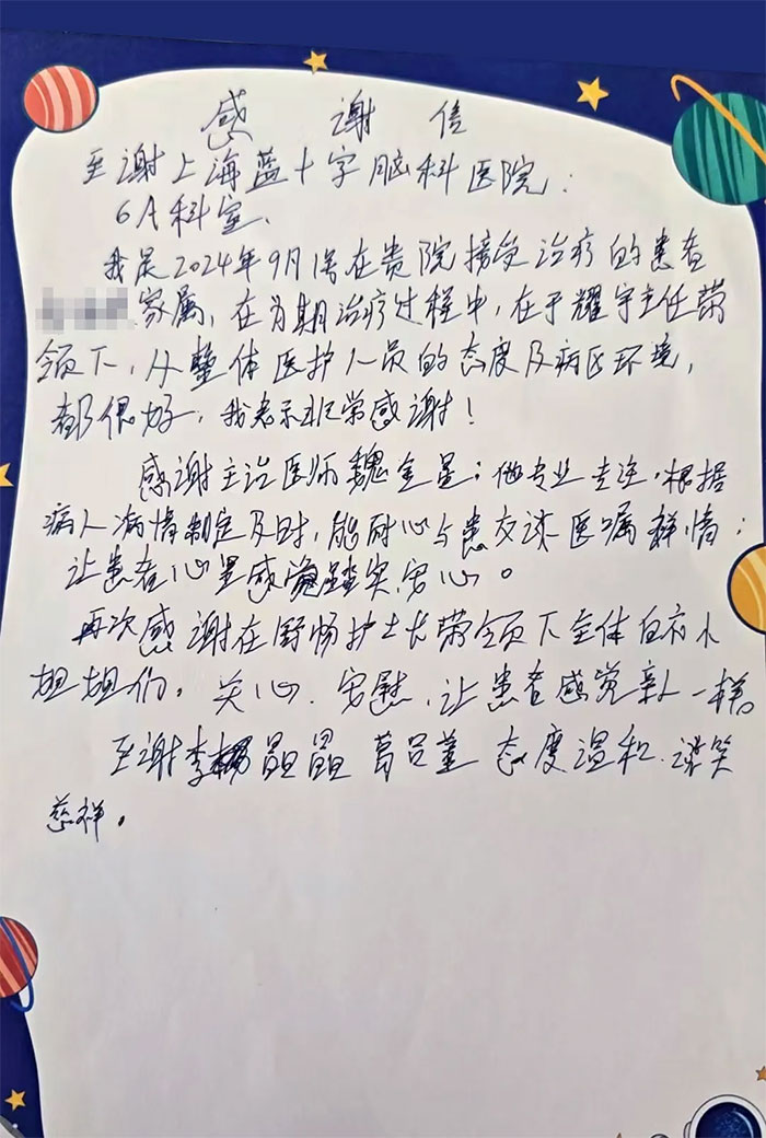“我的父亲.....在蓝十字脑科医院做治疗,几次都有生命危险,在8B所有医院人员、陈主任、医生们的细心照料下,从原来的昏迷不醒,到现在逐渐清醒,意识也有很大康复,感谢所有医护人员尽心尽力的照顾、耐心的给我们解答不懂的地方,再次感谢所有的医护人员,感谢有你们。”