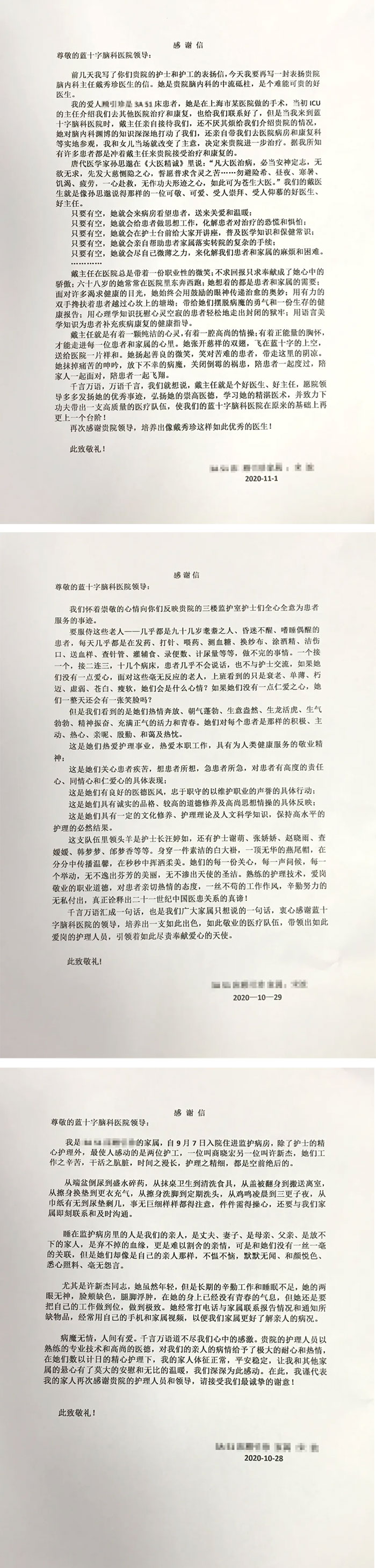 近日,上海蓝十字脑科医院功能神经内科3A病区接连收到了同一患者的三封感谢信,原来是51床患者顾女士的丈夫宋先生亲手将自己写的三封感谢信小心翼翼地打印出来,分别送给了戴秀珍主任、汪婷如护士长和许新杰护工。