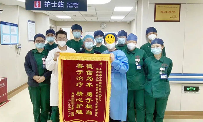 “因为疫情封控关系,家属能亲近亲人探视的次数很少,但是在8A病区医护人员的治疗、护理下,我老伴的病情渐渐稳定趋好,意识越来越清醒,呼吸功能有所恢复,对此,我们家属向8A病区张庆成主任及其医护团队表示深深的感谢和感恩!”看到老伴状态越来越好,8A病区18床家属蔡阿姨为表示感谢,特地写了感谢信,还专门将一面鲜红锦旗送到8A病区张庆成主任团队手上。(了解感谢信详情点击链接文字阅读原文:情暖人心 携手庆生——来自一位患者家属的心声)