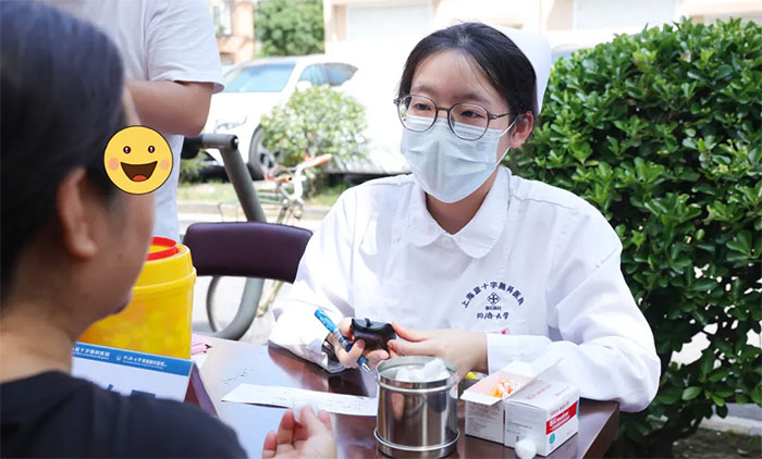 ▲ 尤絮护士为居民测量血糖
