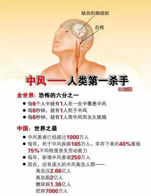 脑中风,长期以来只重视抢救,不知道预防。其实完全可以有效预防。原来,引起脑中风的血栓,往往是颈动脉的血栓,它随血液上行堵塞了脑血管。所以导致颈动脉血栓、引发脑中风的高危因素有:高血压、高胆固醇、高甘油三酯、高血糖、糖尿病、冠心病、慢性牙周病、缺血性眼病、长期大量吸烟、长期大量饮酒。45岁以上女性、55岁以上男性,若有上述一种因素,中青年若有上述两种因素,就要做颈动脉B超检查。这是中华预防医学会会长、工程院院士王陇德在《人民日报》上发出的忠告。