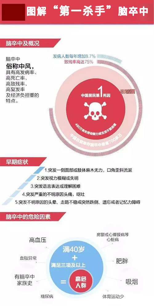 两种脑中风合起来统计,死亡率在30%左右,70%左右可以抢救过来,但会落下偏瘫、失语、痴呆等残疾,将缩短寿命10年以上。