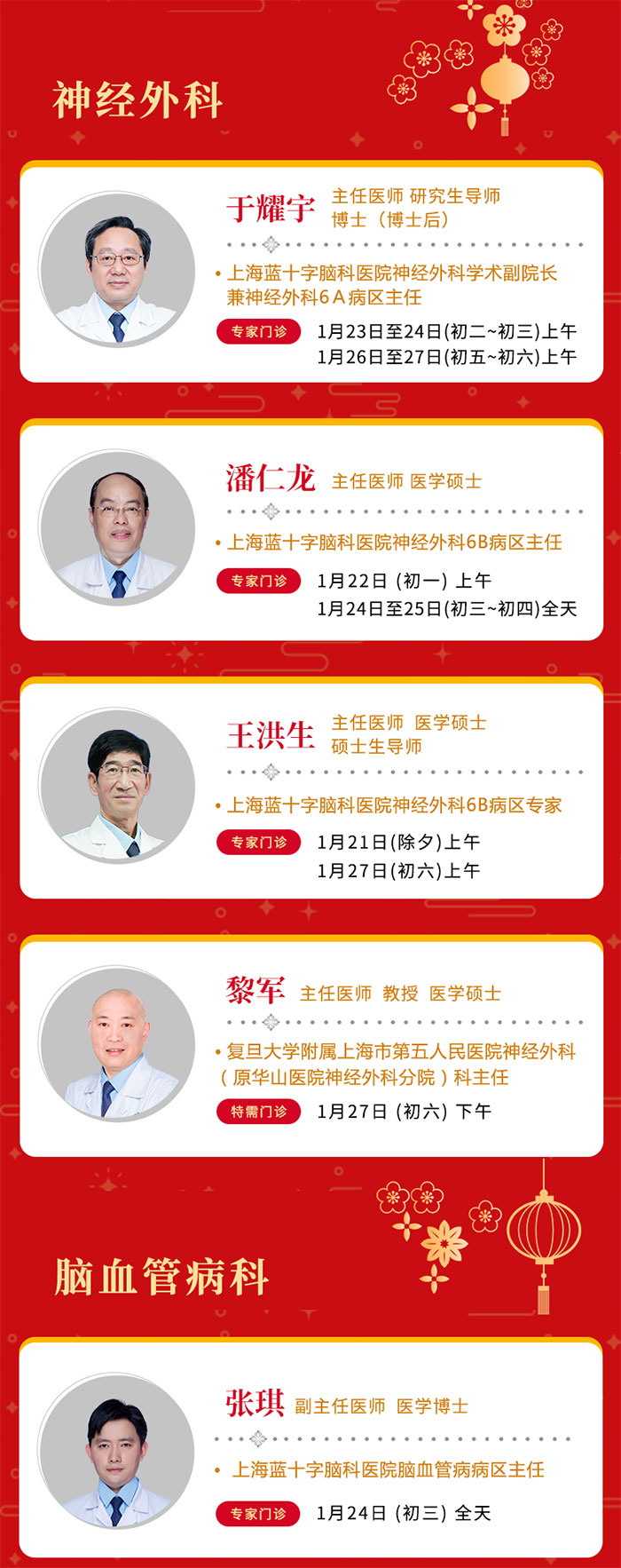 春节假期(1月21日-1月27日),上海蓝十字脑科医院门诊照常开放。为方便市民朋友们寻医问诊,现将医院门诊安排详示如下: