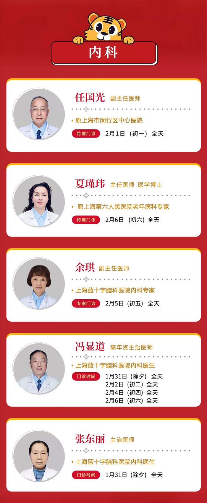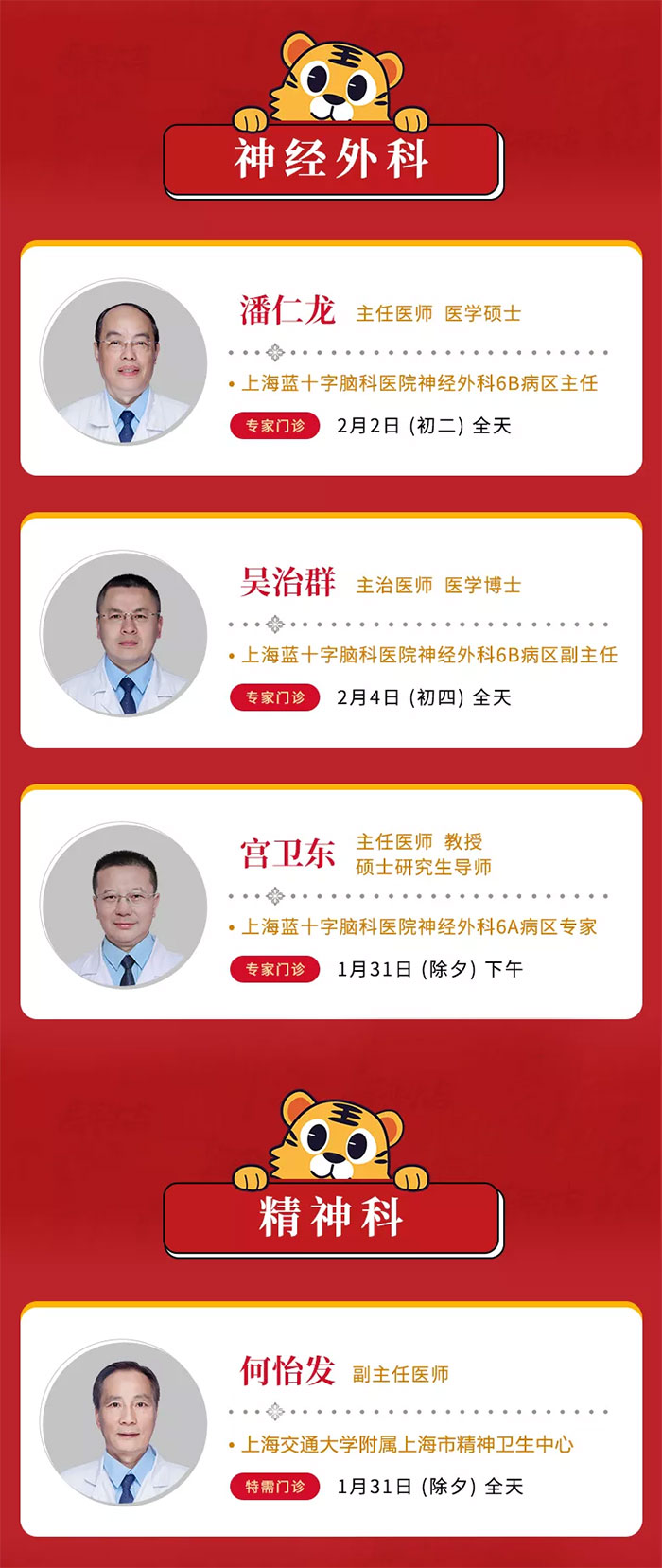 1月31日-2月6日,医院门、急诊照常开放,以方便市民朋友们寻医问诊,具体详示如下: