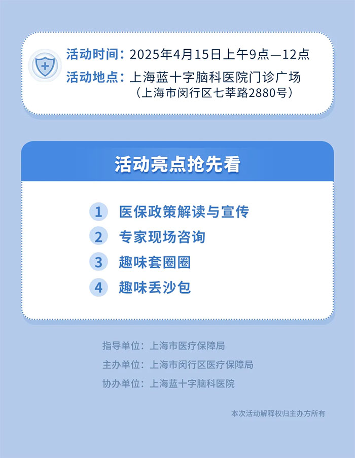 4月15日上午9点,2025年闵行医保基金监管集中宣传月活动将设5个片区同步启动,旨在切实提高群众对医保政策基金监管相关政策法规的知晓度和配合度,坚决打击欺诈骗保行为,营造全社会关注并自觉维护医疗保障基金安全的良好氛围。上海蓝十字脑科医院【同济大学附属蓝十字脑科医院(筹)】作为活动分会场,届时将开展丰富多彩的活动,诚挚邀请各界人士踊跃莅临参与,一起学习医保知识,守护医保基金安全!