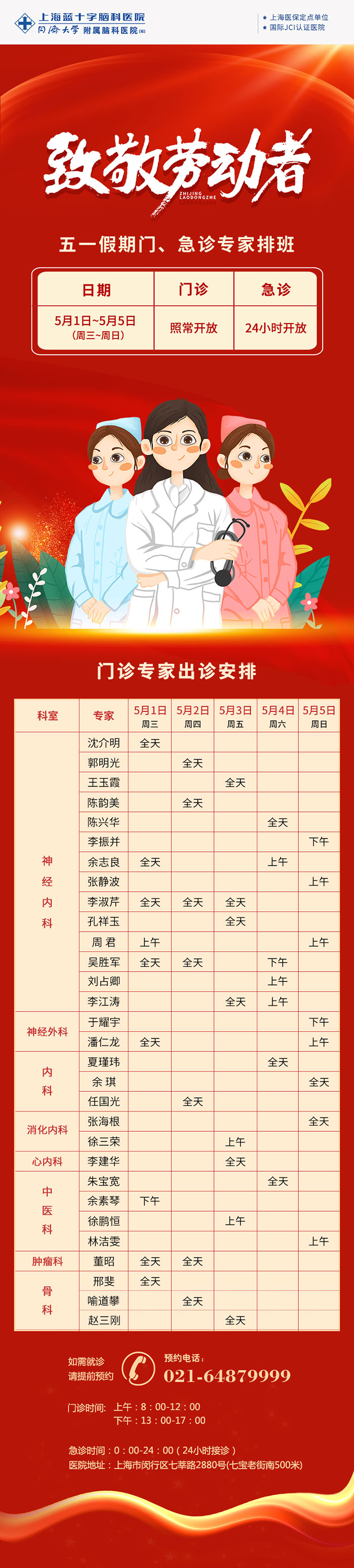 为更好满足广大市民朋友的就医需求,根据国务院有关法定假日安排的规定,结合上海蓝十字脑科医院实际情况,2024年“五一”劳动节假期(5月1日—5日)期间医院门、急诊照常开诊。具体排班公告如下: