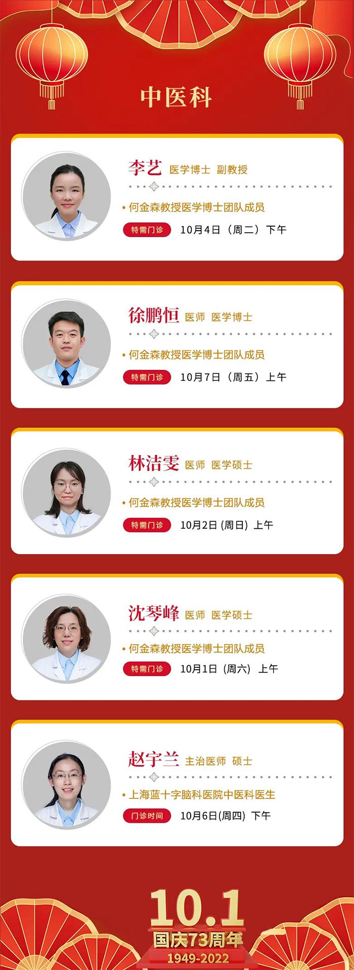 国庆将至,根据《国务院办公厅关于2022年部分节假日安排的通知》,在切实做好疫情防控工作的同时,为保障群众就医需求,我院门诊照常开放。望各位患友按照上海市疫情防控要求,提前规划行程,做好出行安排,尽量预约就诊。详细门诊安排如下: