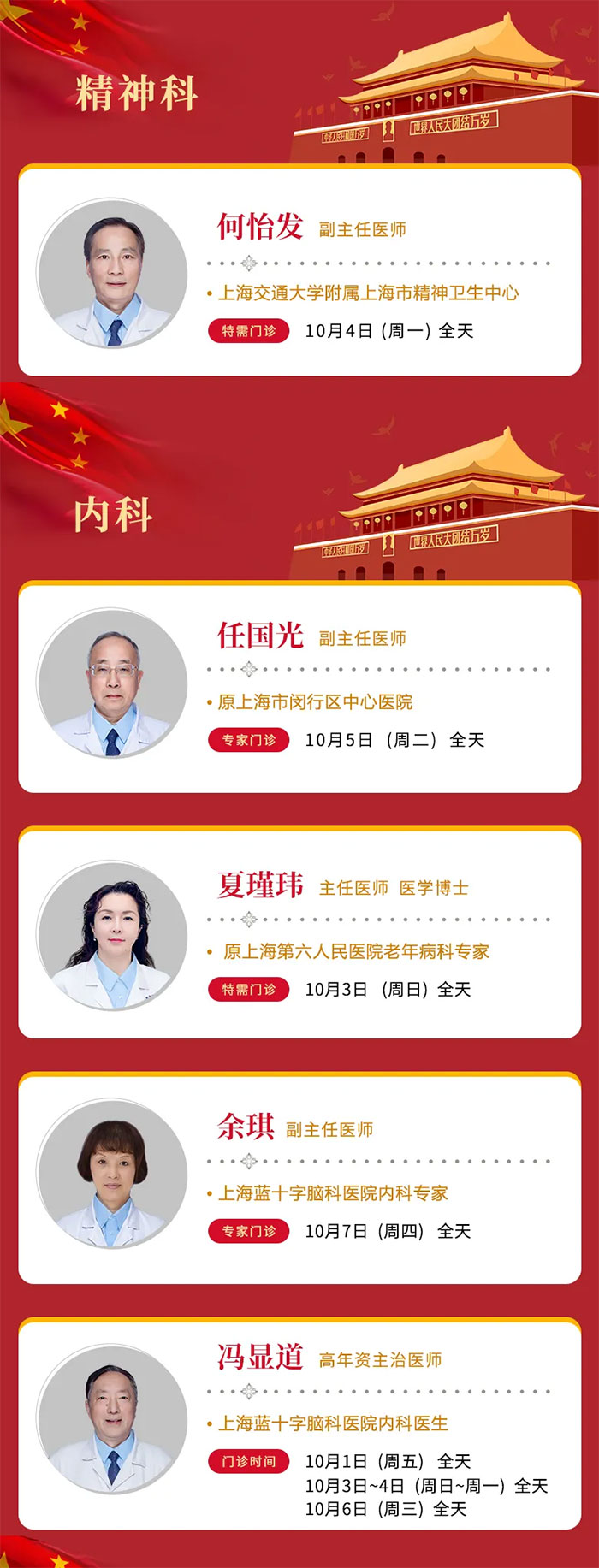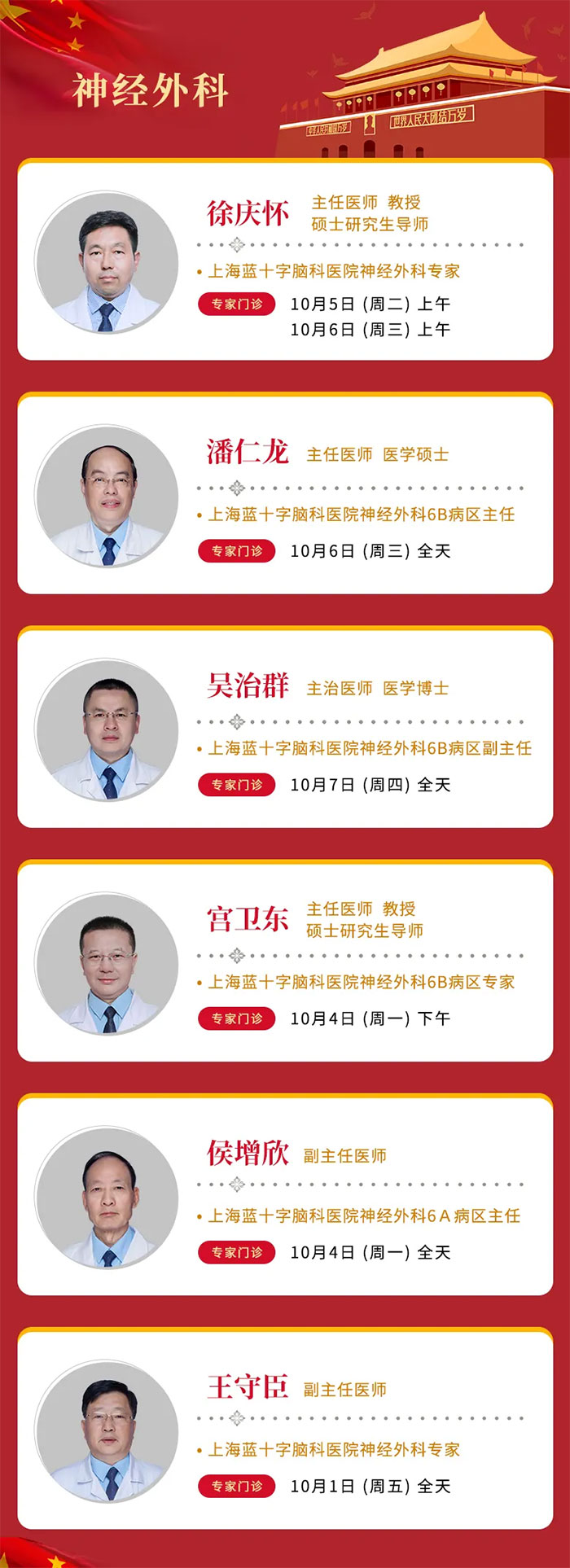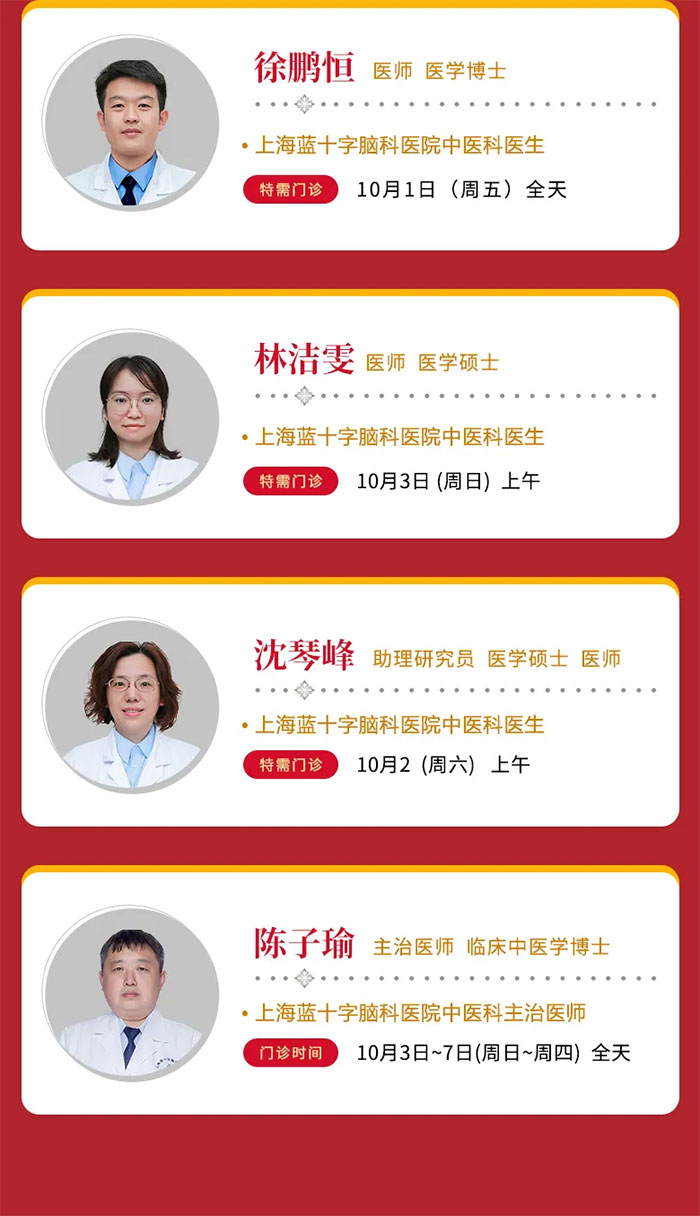 因假期就诊人数较多,建议您关注上海蓝十字脑科医院微信公众号或拨打预约电话(021-64879999)提前预约,以减少您的排队等候时间。庆国庆,大家齐欢乐,五十六个民族共欢腾,祝我们的祖国欣欣向荣!