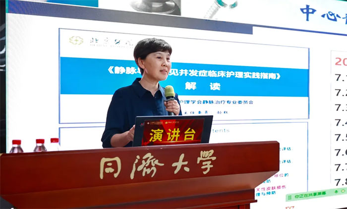 此次培训,钱火红总护士长以《中心静脉通路相关高风险并发症的识别、预防及处理》为主题进行授课分享,阐述了中心静脉通路的概念界定,并围绕静脉炎、渗出与外渗、血管通路装置堵塞、导管性感染、导管相关血栓形成、导管异位、导管相关性皮肤损伤、拔管困难等中心静脉通路常见的8个高风险并发症的识别、预防和处理进行了详细讲解。