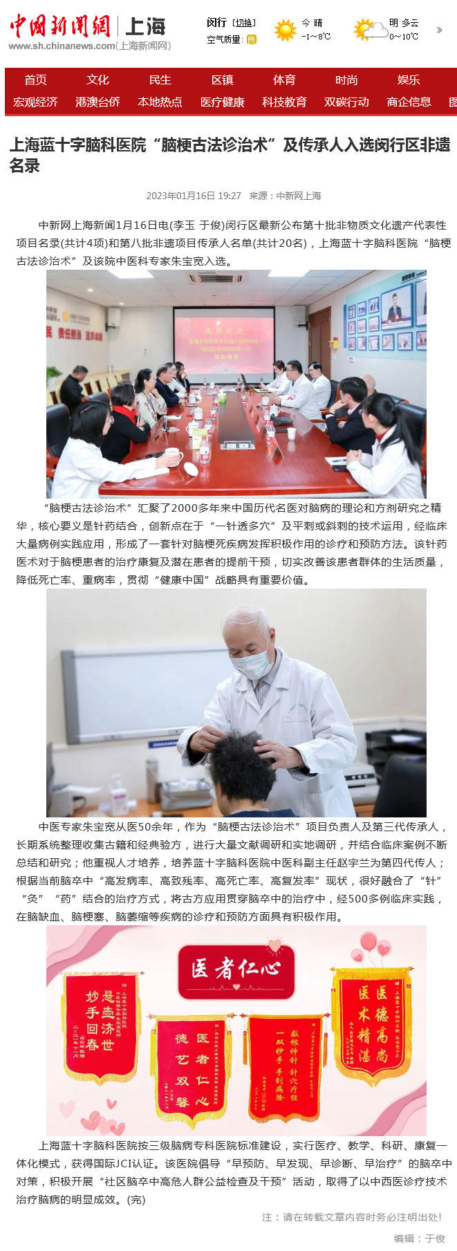 中新网上海新闻1月16日电(李玉 于俊)闵行区最新公布第十批非物质文化遗产代表性项目名录(共计4项)和第八批非遗项目传承人名单(共计20名),上海蓝十字脑科医院“脑梗古法诊治术”及该院中医科专家朱宝宽入选。