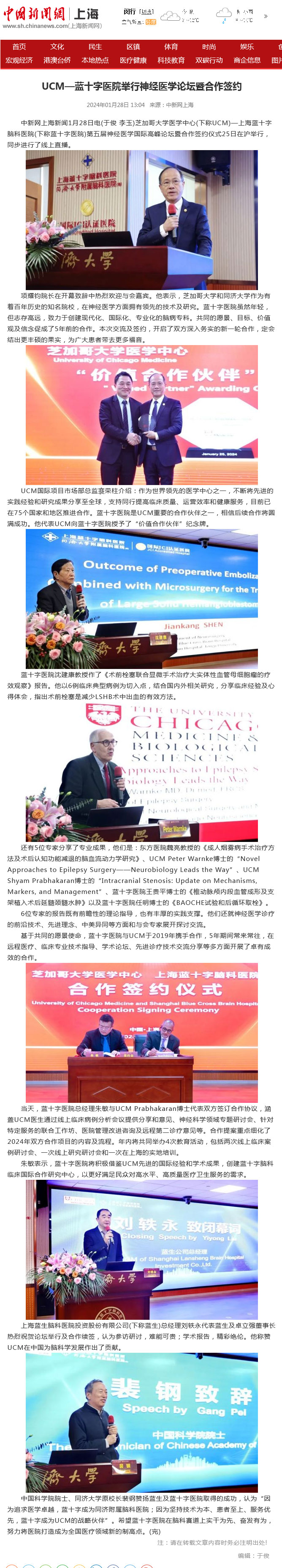 中新网上海新闻1月28日电(于俊 李玉)芝加哥大学医学中心(下称UCM)—上海蓝十字脑科医院(下称蓝十字医院)第五届神经医学国际高峰论坛暨合作签约仪式25日在沪举行,同步进行了线上直播。