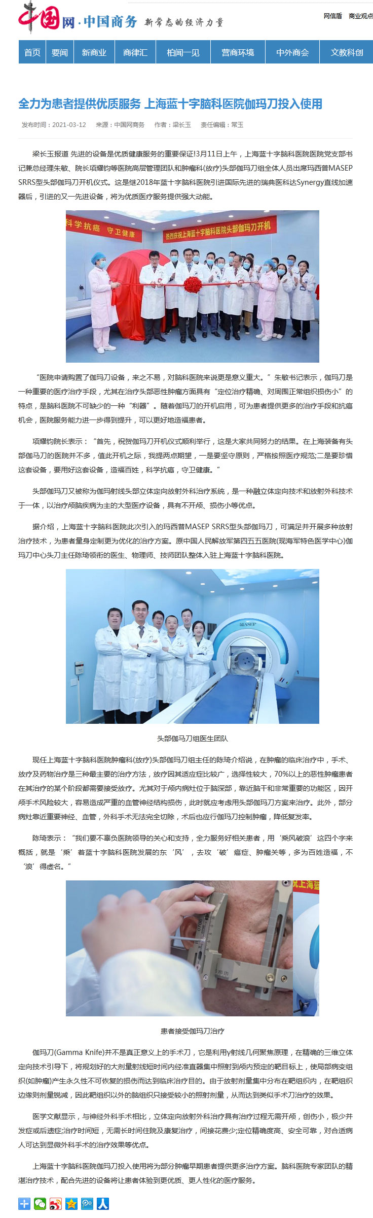 梁长玉报道 先进的设备是优质健康服务的重要保证!3月11日上午,上海蓝十字脑科医院医院党支部书记兼总经理朱敏、院长项耀钧等医院高层管理团队和肿瘤科(放疗)头部伽玛刀组全体人员出席玛西普MASEP SRRS型头部伽玛刀开机仪式。这是继2018年蓝十字脑科医院引进先进的瑞典医科达Synergy直线加速器后,引进的又一先进设备,将为优质医疗服务提供强大动能。