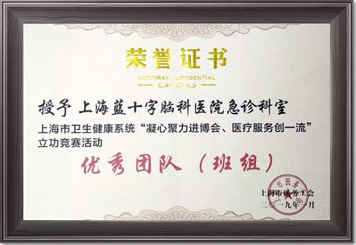 上海蓝十字脑科医院医院急诊科以其优秀表现,被上海市医务工会授予本次立功竞赛活动“优秀团队”称号,展示了上海蓝十字脑科医院作为国际JCI认证的脑科医院的实力,更向世界展示了魅力上海、多彩七宝的良好形象。