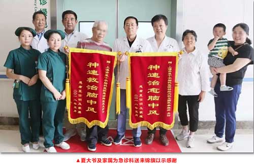 最终夏大爷顺利康复,左侧肢体能正常活动,言语功能基本恢复,基本未留后遗症。出院前,家属为感谢医务人员的“神速”救治,给急诊科齐洪阁主任以及神经内科李振并主任各送来了锦旗。“真是感谢你们,太感谢你们了,非常感谢......。”