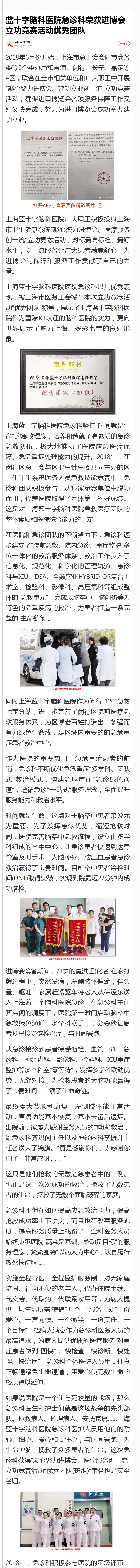 上海蓝十字脑科医院医院急诊科以其优秀表现,被上海市医务工会授予本次立功竞赛活动“优秀团队”称号,展示了上海蓝十字脑科医院作为国际JCI认证的脑科医院的实力,更向世界展示了魅力上海、多彩七宝的良好形象。