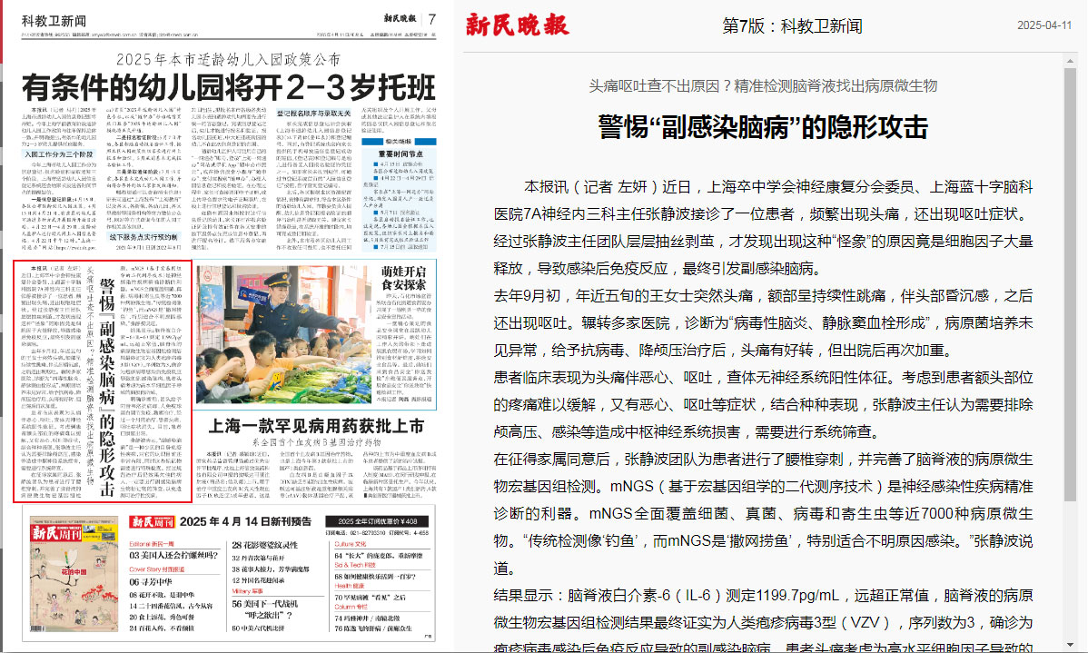 在征得家属同意后,张静波团队为患者进行了腰椎穿刺,并完善了脑脊液的病原微生物宏基因组检测。mNGS(基于宏基因组学的二代测序技术)是神经感染性疾病精准诊断的利器。mNGS全面覆盖细菌、真菌、病毒和寄生虫等近7000种病原微生物。“传统检测像‘钓鱼’,而mNGS是‘撒网捞鱼’,特别适合不明原因感染。”张静波说道。