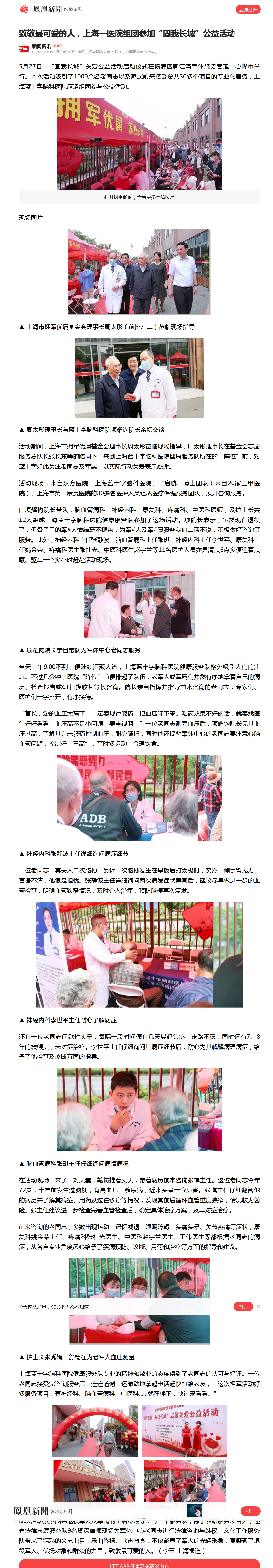 5月27日,“固我长城”关爱公益活动启动仪式在杨浦区新江湾军休服务管理中心隆重举行。本次活动吸引了1000余名老同志以及家属前来接受总共30多个项目的专业化服务,上海蓝十字脑科医院应邀组团参与公益活动。