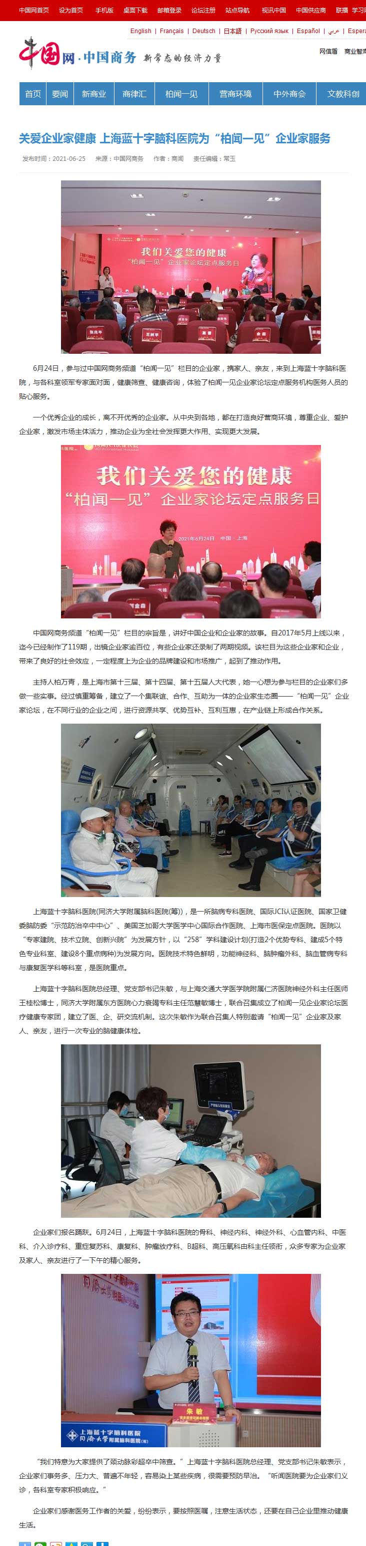 6月24日,参与过中国网商务频道“柏闻一见”栏目的企业家,携家人、亲友,来到上海蓝十字脑科医院,与各科室领军专家面对面,健康筛查、健康咨询,体验了柏闻一见企业家论坛定点服务机构医务人员的贴心服务。