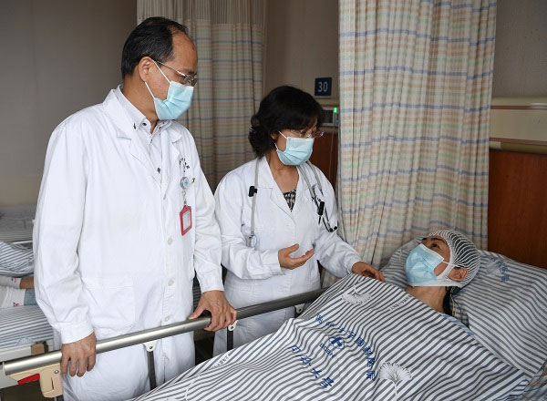 图为院长项耀钧教授(左一)与神经内科主任张静波在病房探视脑病患者。孙国根摄