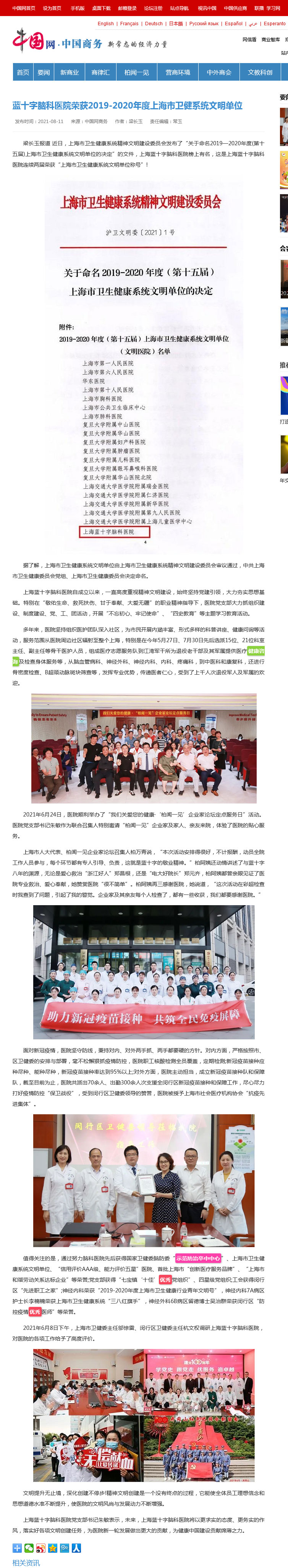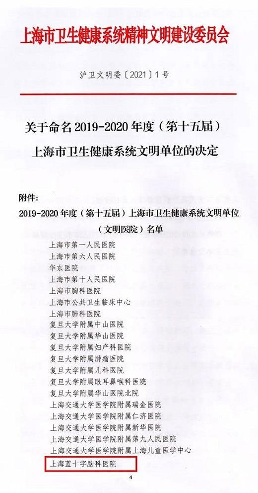 梁长玉报道 近日,上海市卫生健康系统精神文明建设委员会发布了“关于命名2019—2020年度(第十五届)上海市卫生健康系统文明单位的决定”的文件,上海蓝十字脑科医院榜上有名,这是上海蓝十字脑科医院连续两届荣获“上海市卫生健康系统文明单位称号”!