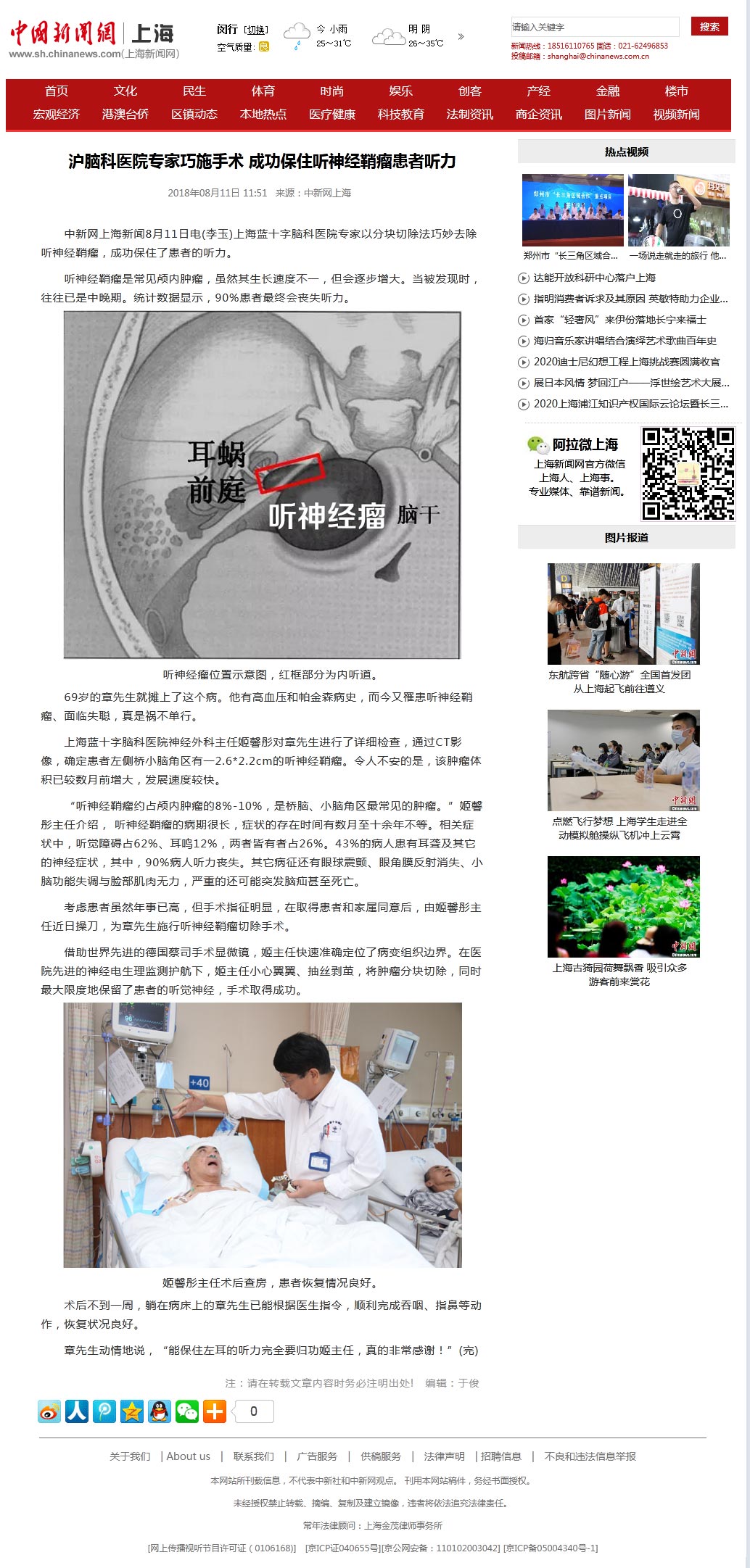 中新网上海新闻8月11日电(李玉)上海蓝十字脑科医院专家以分块切除法巧妙去除听神经鞘瘤,成功保住了患者的听力。