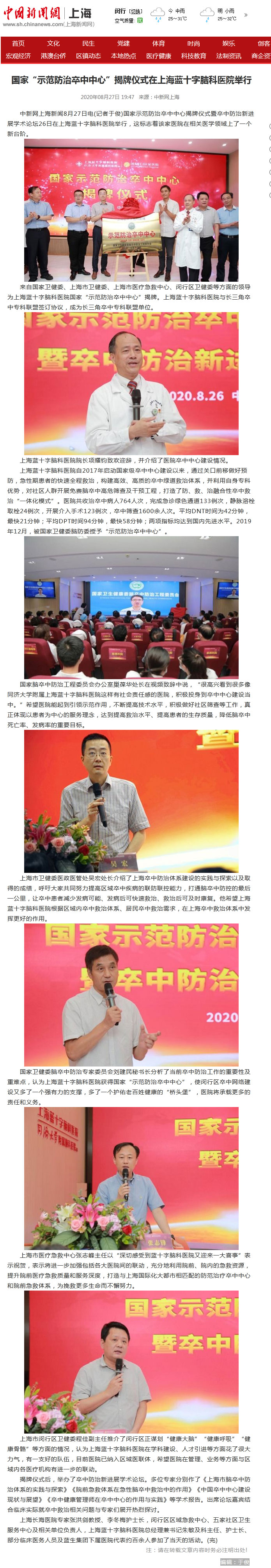 中新网上海新闻8月27日电(记者于俊)国家示范防治卒中中心揭牌仪式暨卒中防治新进展学术论坛26日在上海蓝十字脑科医院举行,这标志着该家医院在相关医学领域上了一个新台阶。