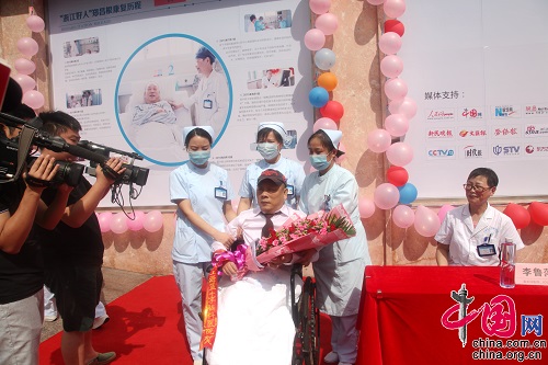 郑昌根在蓝十字脑科医院工作人员护送下正式出院返乡