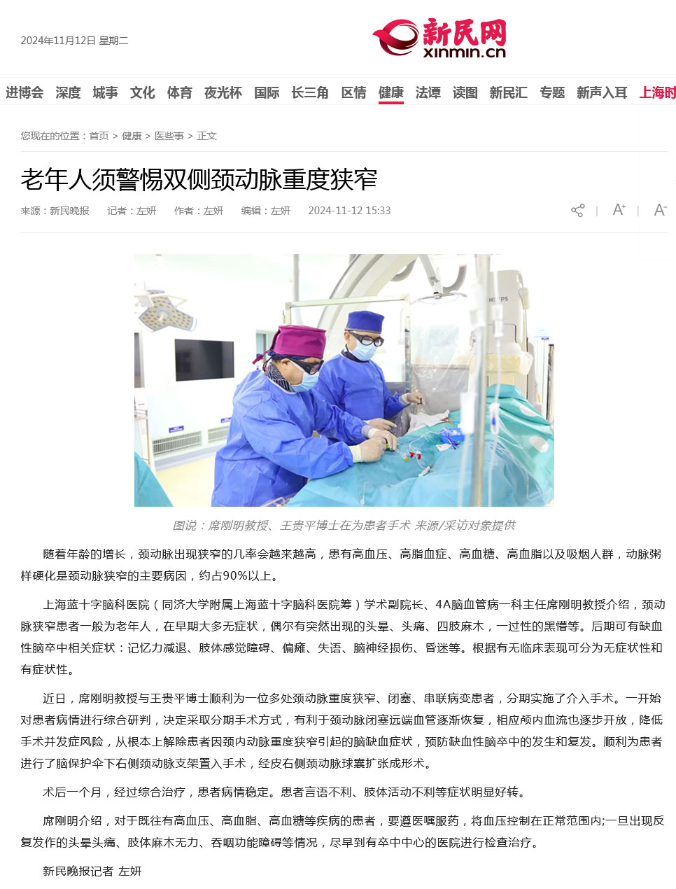 近日,席刚明教授与王贵平博士顺利为一位多处颈动脉重度狭窄、闭塞、串联病变患者,分期实施了介入手术。一开始对患者病情进行综合研判,决定采取分期手术方式,有利于颈动脉闭塞远端血管逐渐恢复,相应颅内血流也逐步开放,降低手术并发症风险,从根本上解除患者因颈内动脉重度狭窄引起的脑缺血症状,预防缺血性脑卒中的发生和复发。顺利为患者进行了脑保护伞下右侧颈动脉支架置入手术,经皮右侧颈动脉球囊扩张成形术。