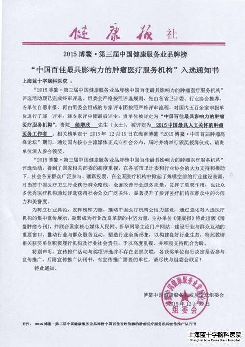 上海蓝十字脑科医院荣登2015博鳌·第三届中国健康服务业品牌榜