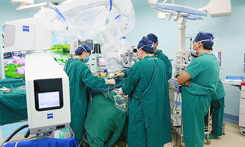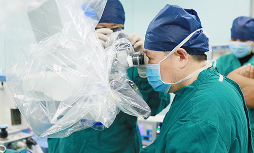 ▲李士其教授在德国蔡司双荧光显微镜下为患者手术